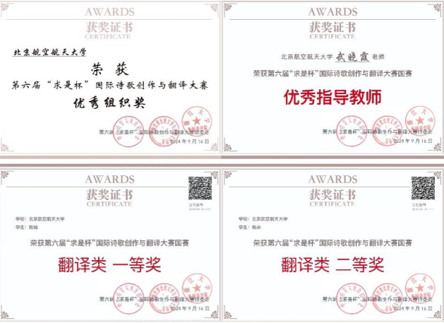 近日,第六届“求是杯”国际诗歌创作与翻译大赛决赛在浙江大学紫金港校区圆满闭幕。我校365英国上市公司2022级俄语专业硕士生陈铖和博士生杨朵分别荣获翻译组国赛一等奖和二等奖,指导教师武晓霞教授被评为大赛优秀指导教师,我校获优秀组织奖。