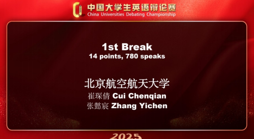 近日,中国大学生英语辩论赛(CUDC)全国总决赛落下帷幕。在顿超老师、胥国红老师的指导下,我校365英国上市公司翻译系2022级学生崔琛倩、2024级学生张懿宸代表北航参赛,与来自全国近100所高校的200余名优秀辩手同场竞技。经过五轮激烈角逐,我校代表队最终以积分第一名的成绩斩获国家一等奖,其中,崔琛倩和张懿宸分列个人辩手积分总排名第一与第三,均荣获“最佳辩手奖”,顿超老师荣获“优秀指导教师奖”。