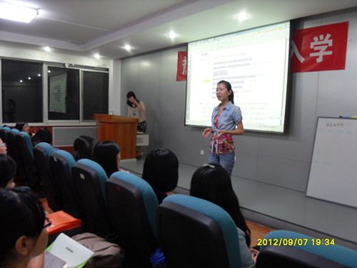 活动由研会主席张蔷蔷同学主持。首先是一段研会活动的幻灯片展示,图片回顾了过去一年研会的各项工作和活动,其乐融融的画面让新生们初步感受到了研会大家庭的温暖和团结。然后各部长和主席介绍了各自的部门详情、职责分配以及工作要求和挑战,向下届的学弟学妹们表达了热烈的欢迎、发出了诚挚的邀请。接下来的新生上台竞选将气氛拉到高潮:他们有的机智幽默,有的经验丰富,有的能歌善舞,对主席团和各部长提出的问题应对自如。选举会最后,新选出来的2012届外院研会骨干们积极地和2011级骨干们交流,活动在阵阵掌声和愉悦的气氛中圆满结束。