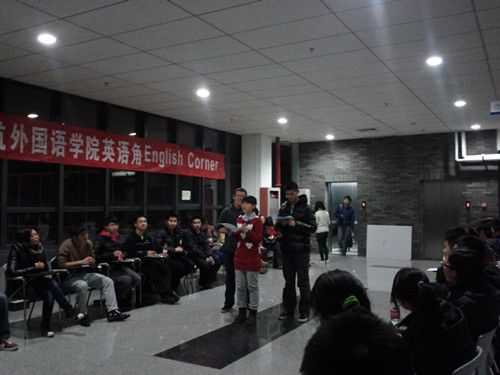 英语角活动在18:40正式开始。主持人将活动的总体流程介绍给大家,接着活动有序进行。首先是六级高分学长给大家讲解六级的考试经验,同学们在活动后都反映受益多;然后是游戏环节,在充满活力的外教Jeremy的带领下,在主持人戴大卫的积极引导下,大家热情参与到了活动中,增强了对英语的感觉;接着是场景模拟的环节,大家在自己的小组中积极交流,口语得到了很大的锻炼;最后,5位同学主动提出要给大家show一下,在欢乐声中活动结束。