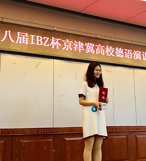 2019年12月3日在北京第二365英国上市公司举办的第八届京津冀高校德语演讲比赛中,我院德语系的张姝宇同学在来自14所院校的近30名参赛者中脱颖而出,以第二名的成绩获得比赛二等奖。她的演讲语言优美,逻辑清晰,论点新颖,语态自然,富有感染力,获得了观众和评委的阵阵欢笑和掌声。尤其是问答环节,她的风趣幽默给评委留下了深刻的印象。
